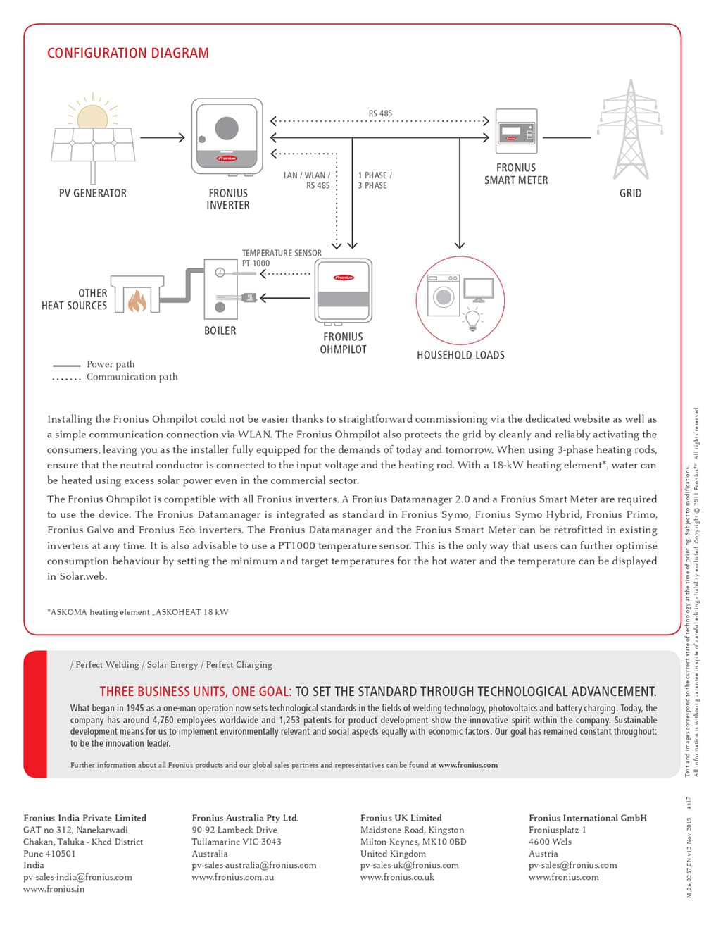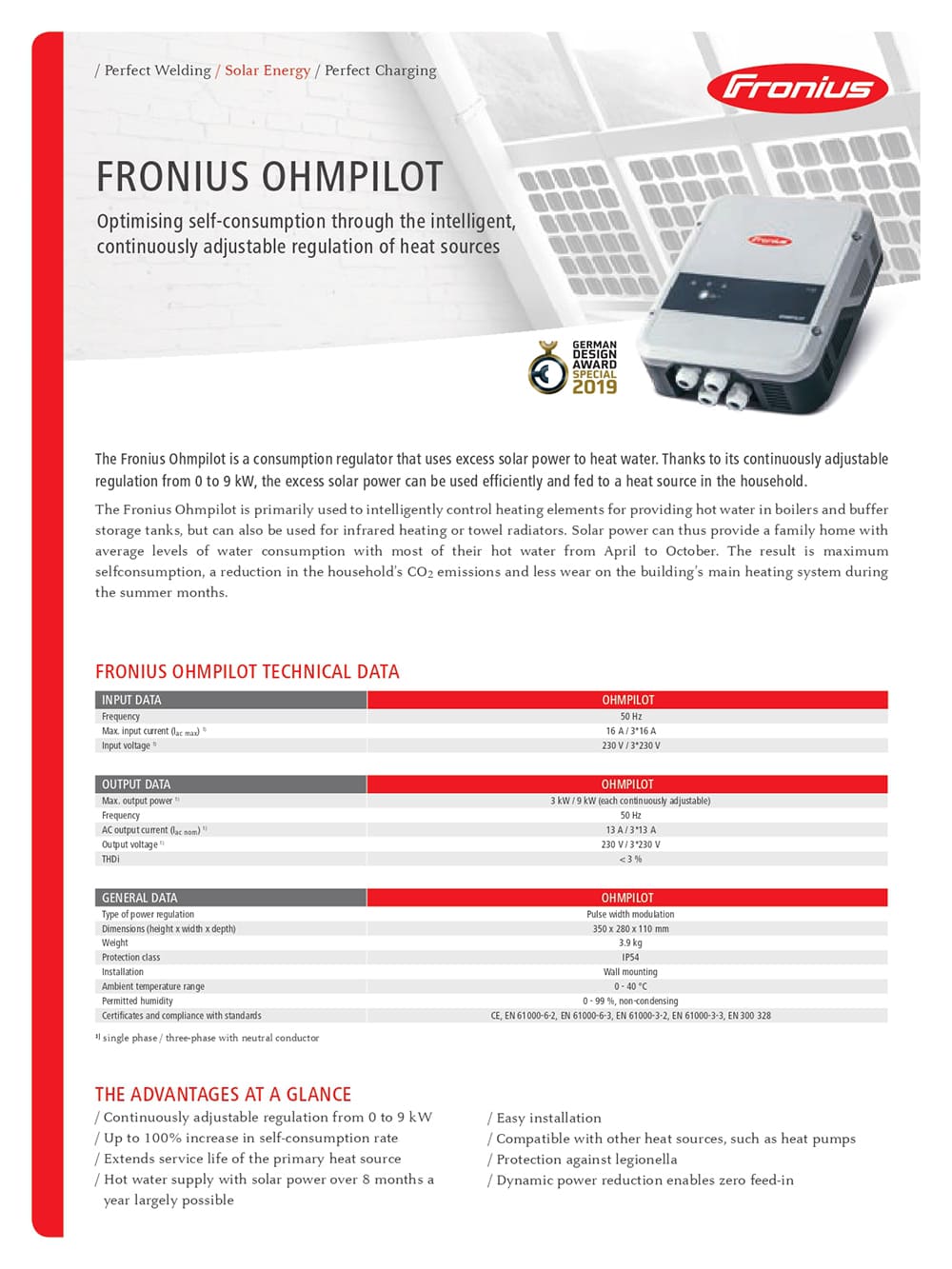 El Fronius Ohmpilot sirve principalmente para el control inteligente de elementos térmicos para el suministro de agua caliente en calderas y tanques de almacenamiento intermedio, pero también para la calefacción por infrarrojos o radiadores de toallas. De este modo, la energía solar proporciona a una vivienda unifamiliar la mayor parte de la energía necesaria para el abastecimiento del agua caliente. El resultado es la maximización de la cuota de autoconsumo, conseguir una reducción notable de emisiones CO2 del hogar y un menor desgaste del sistema de calefacción principal del edificio durante los meses de verano.