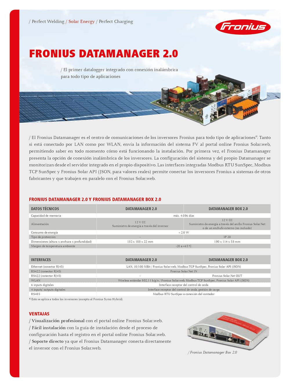 Ethernet (conector RJ45): LAN, 10/100 MBit / Fronius Solar.web, Modbus TCP SunSpec, Fronius Solar API (JSON)