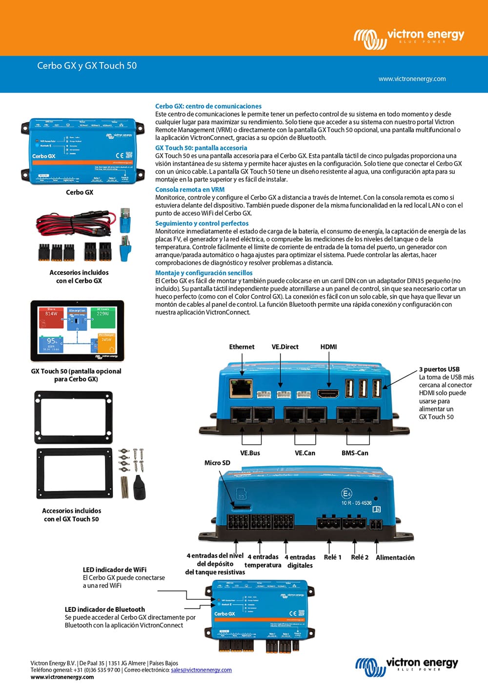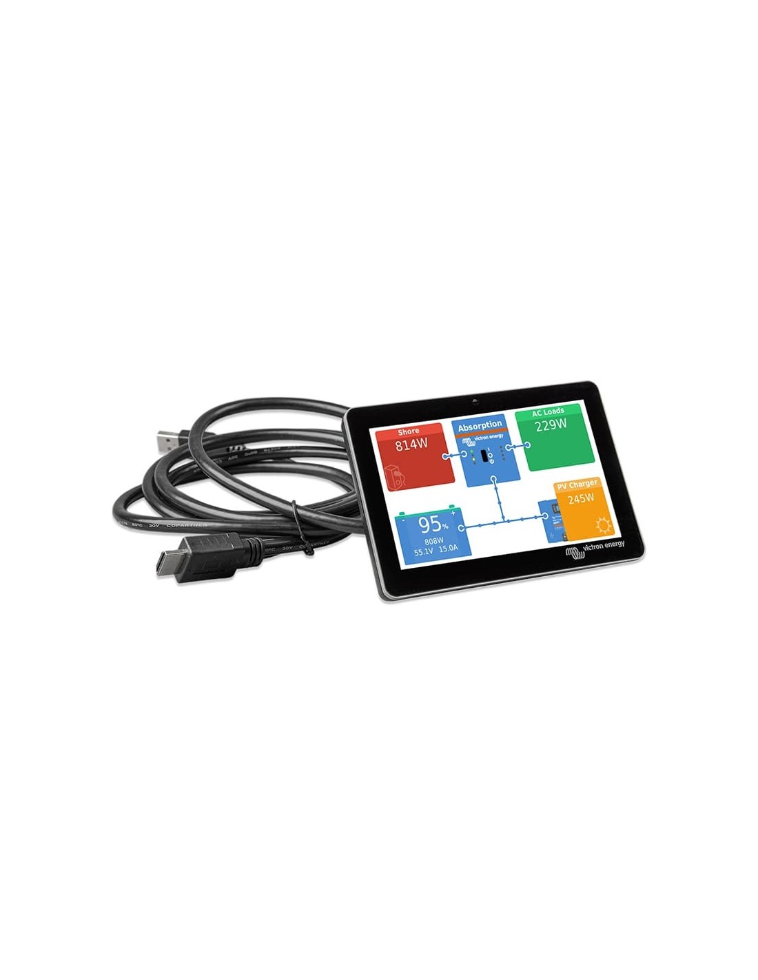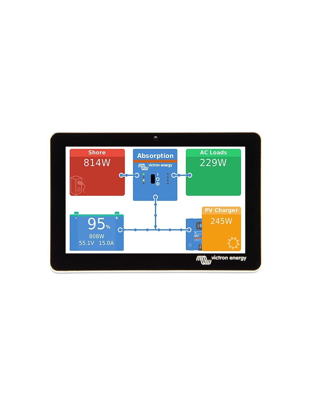 GX Touch 50 es una pantalla accesoria para el Cerbo GX. Esta pantalla táctil de cinco pulgadas proporciona una visión instantánea de su sistema y permite hacer ajustes en la configuración. Solo tiene que conectar el Cerbo GX con un único cable. La pantalla GX Touch 50 tiene un diseño resistente al agua, una configuración apta para su montaje en la parte superior y es fácil de instalar.