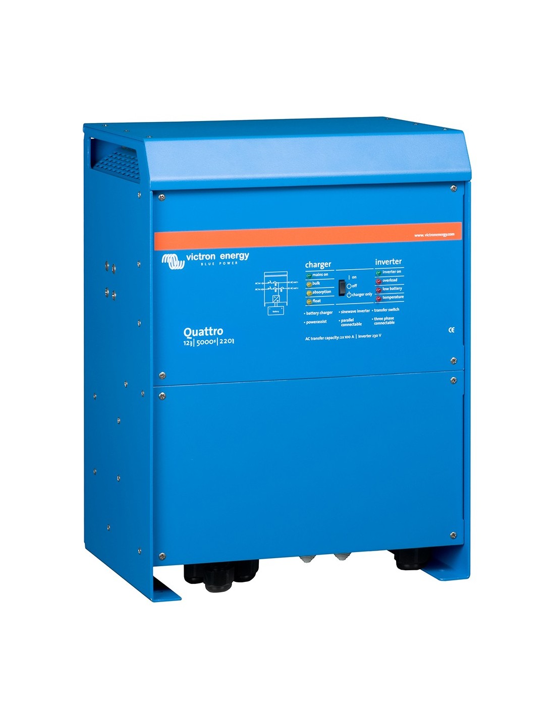Hasta 6 unidades Quattro pueden funcionar en paralelo. Seis unidades 48/10000/140, por ejemplo, darán una potencia de salida de 48kW / 60kVA y una capacidad de carga de 840 amperios.