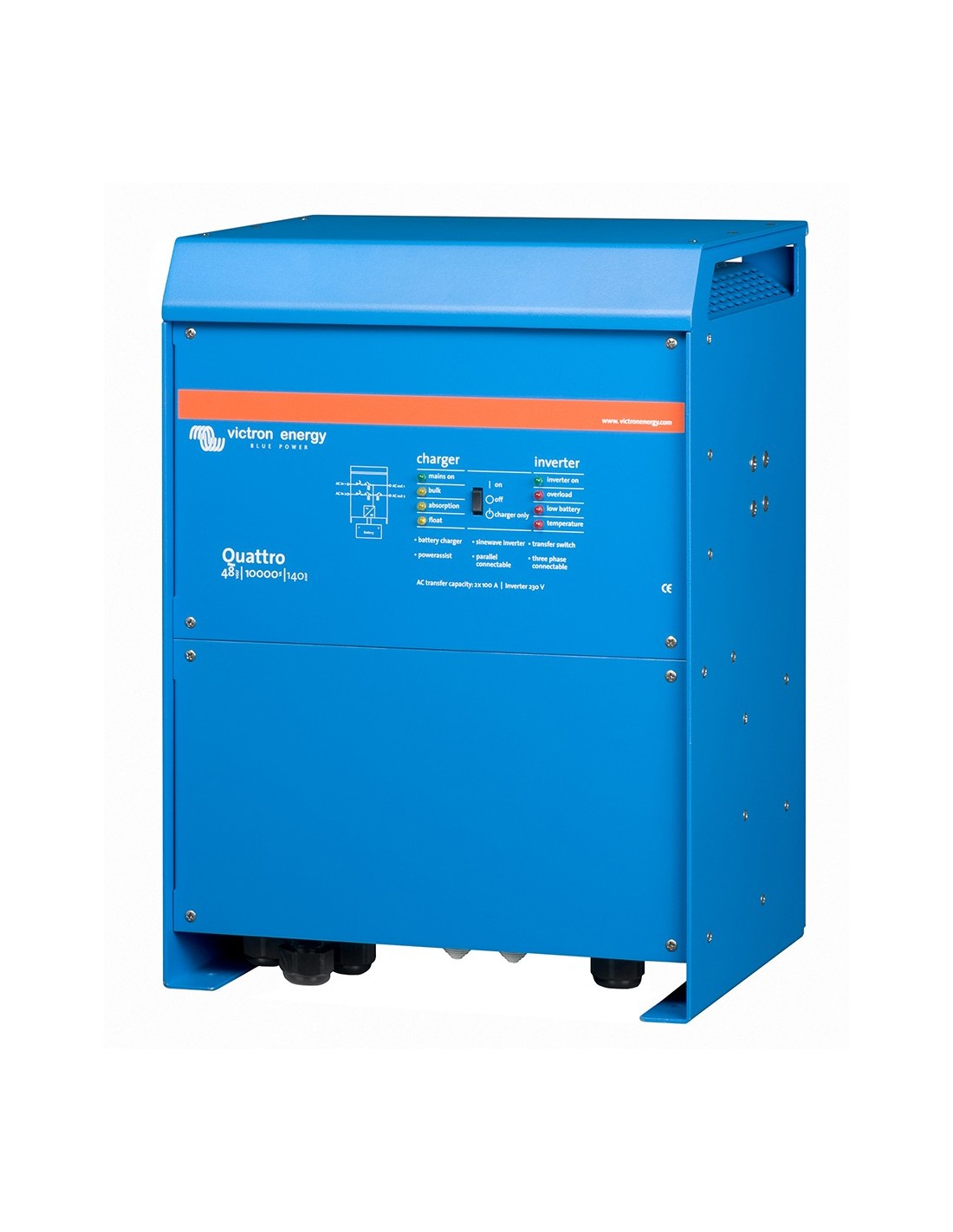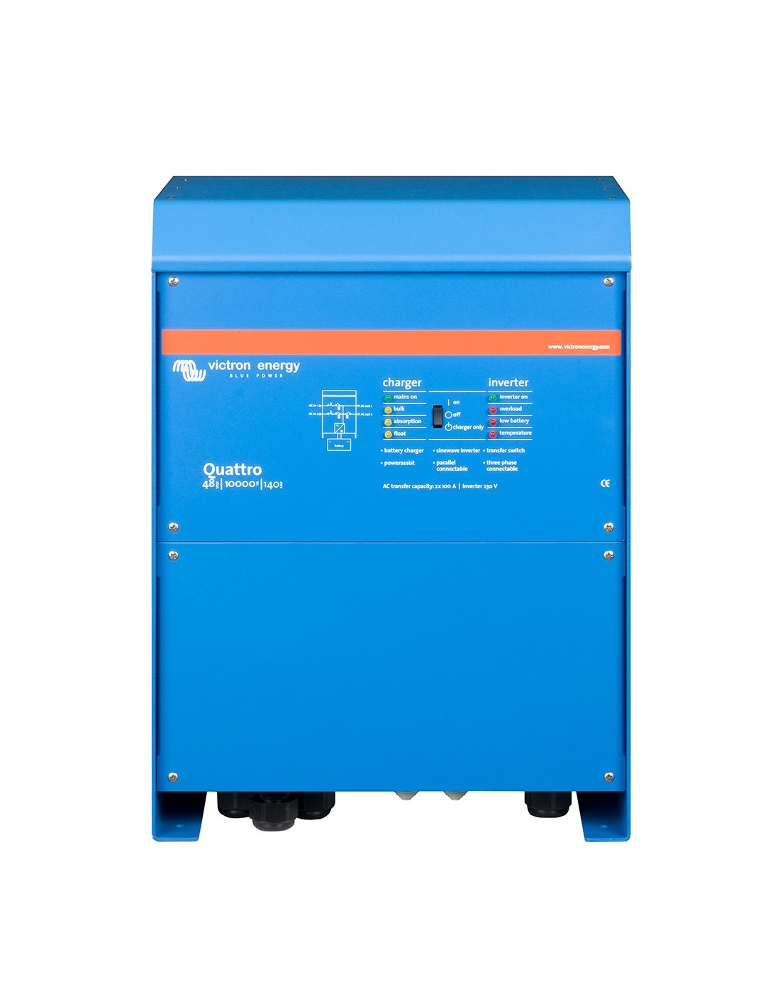 Hasta 6 unidades Quattro pueden funcionar en paralelo. Seis unidades 48/10000/140, por ejemplo, darán una potencia de salida de 48kW / 60kVA y una capacidad de carga de 840 amperios.