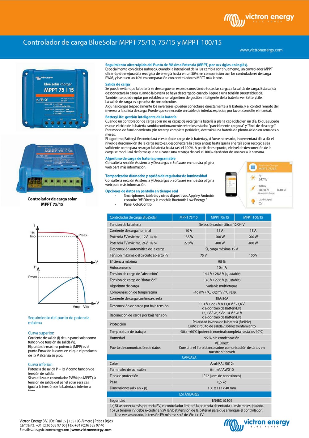 El regulador de carga Victron MPPT75/15 controla la carga hasta 15 A y tensión Fotovoltaica hasta 75 V.