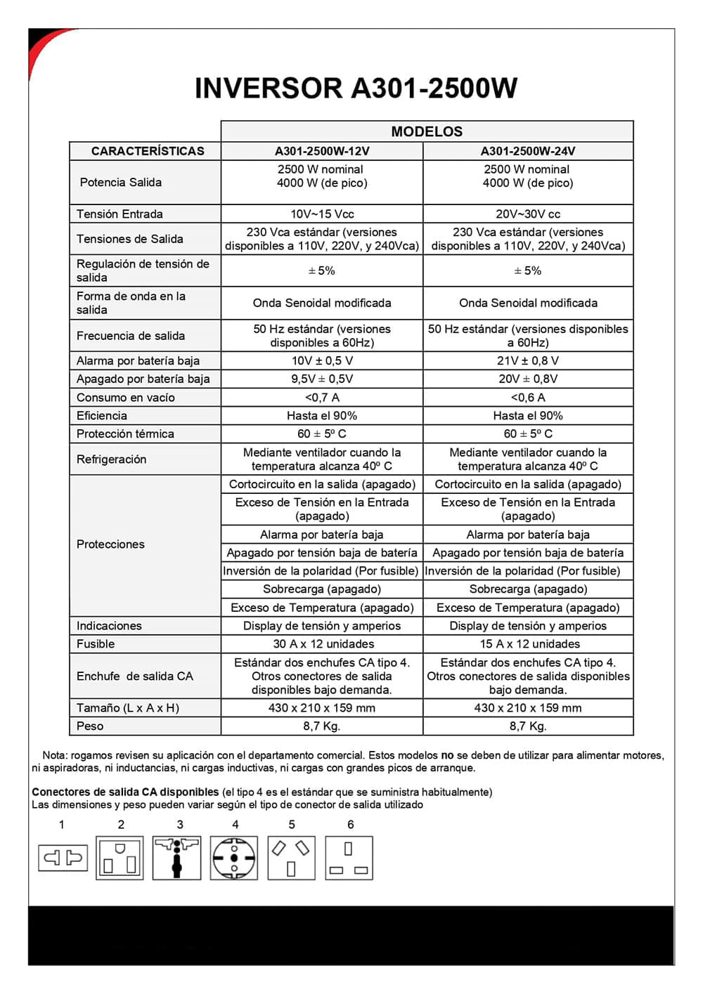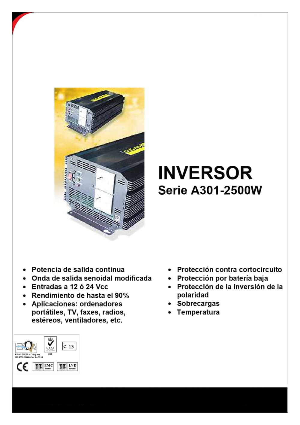 Inversor onda trapezoidal CC/CA con Salida USB. Tiene potencia de salida continua, Convierte la corriente de entrada con un rango entre 10 y 15 Vcc y la transforma en 230Vca. Trabaja con Onda de salida senoidal modificada, a una frecuencia de 50 Hz, y soporta una potencía de 2500W con picos de 4000W. Tiene un rendimiento del 90%, protección contra contorcircuito, protección por batería baja, protección de la inversión de polaridad, Protección de sobrecargas y protección de temperatura.