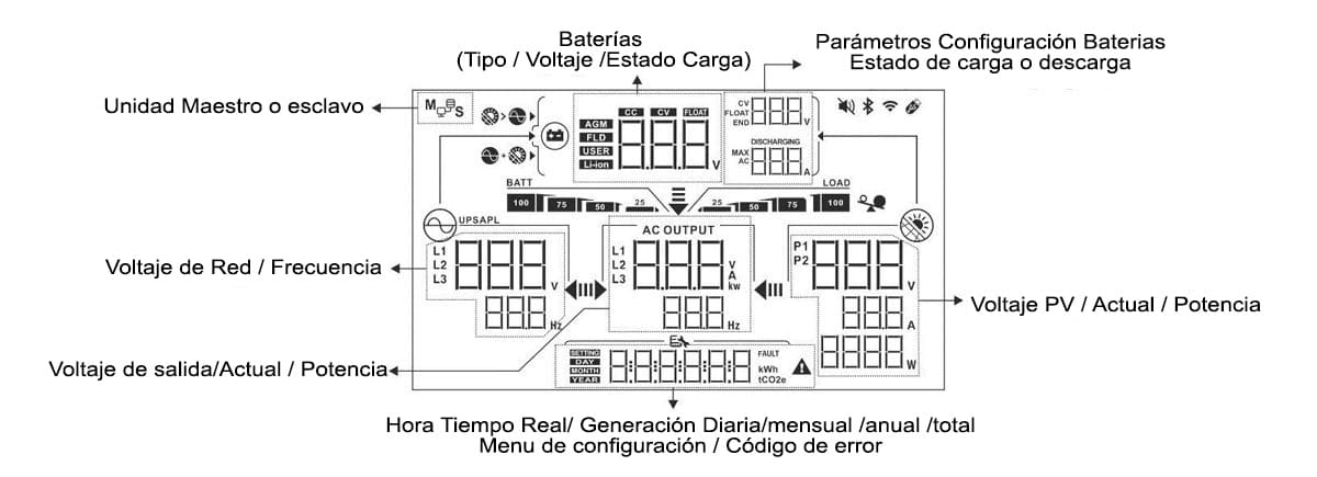 Su cargador integrado de hasta 120A permite recargar las baterías rápidamente desde la red eléctrica o un generador cuando la producción solar es insuficiente.
