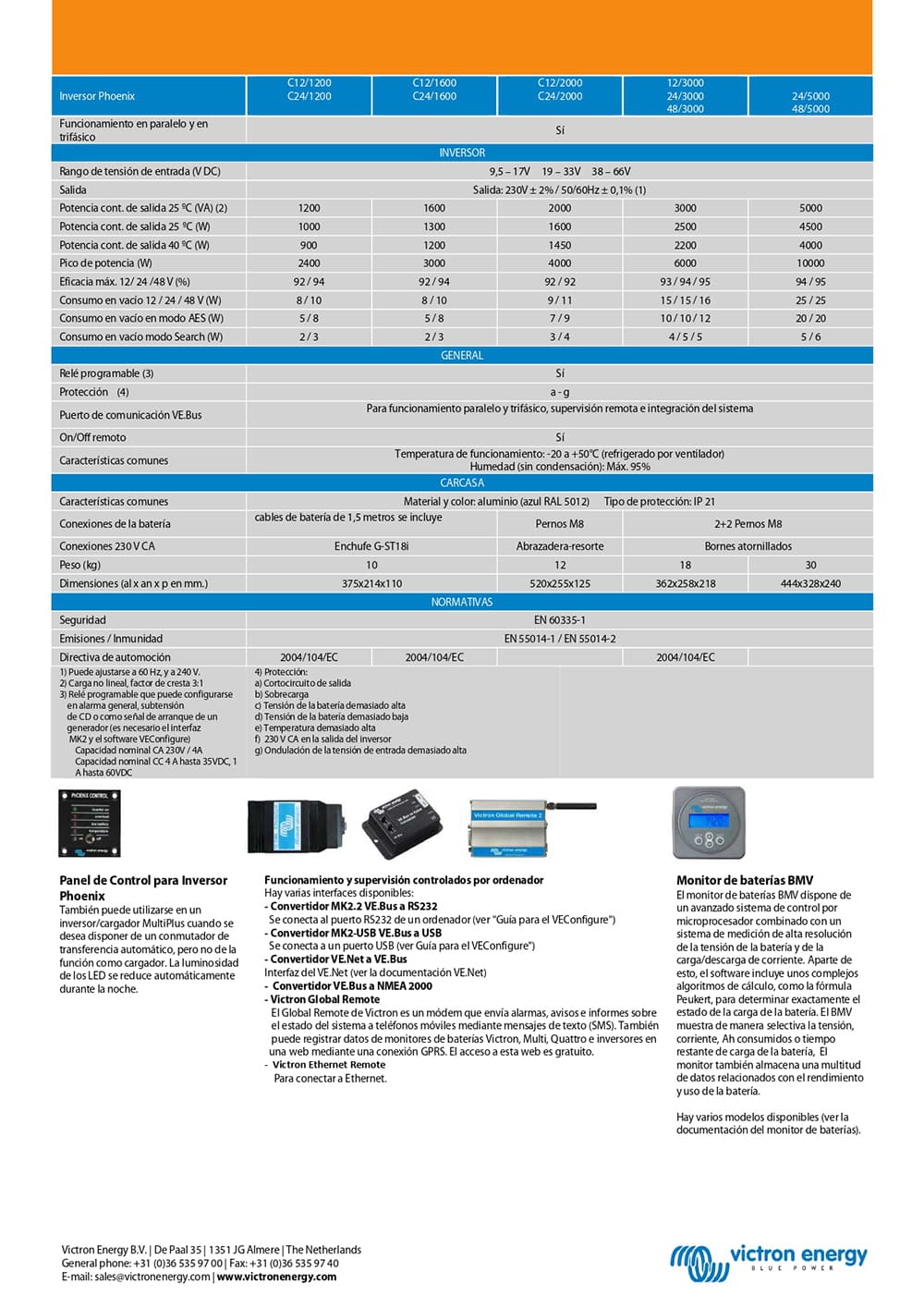 El inversor Phoenix se caracteriza por poseer en una sola carcasa compacta, un poderoso inversor sinusoidal, un sofisticado cargador de baterías con tecnología adaptable y un conmutador de CA de alta velocidad.