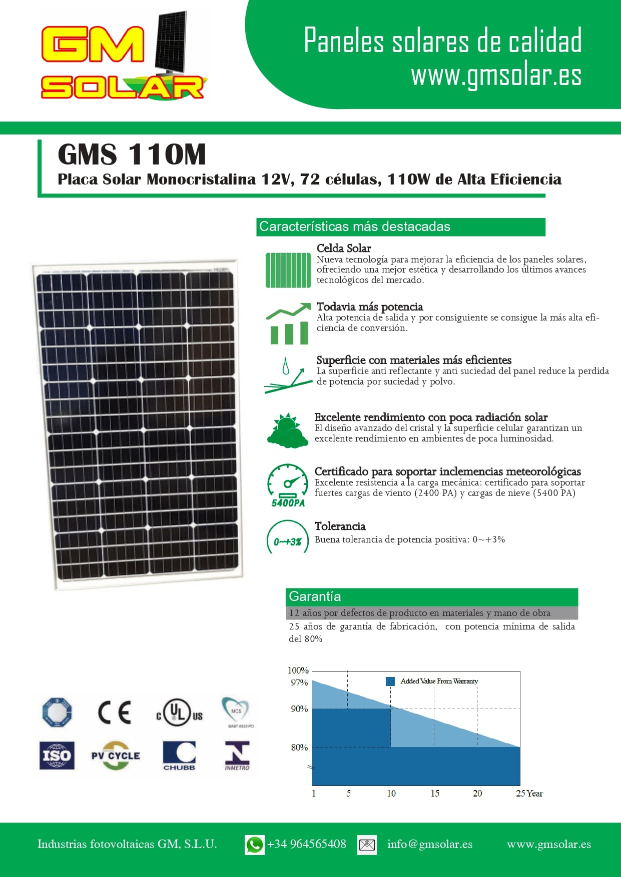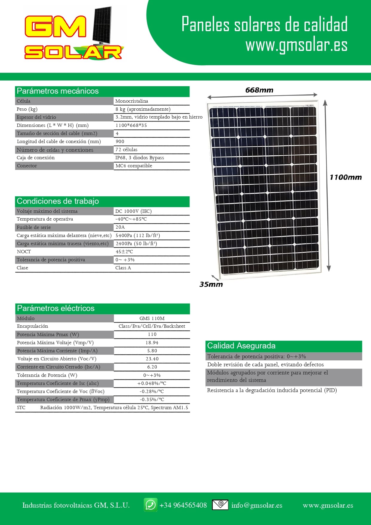 La Placa solar GMSOLAR 110W/12V de ComercioSolar es un panel solar de alto rendimiento, durabilidad y fiabilidad. Adecuado para cualquier instalación fotovoltaica, tanto instalaciones solares aisladas como de autoconsumo, telemetría, etc.