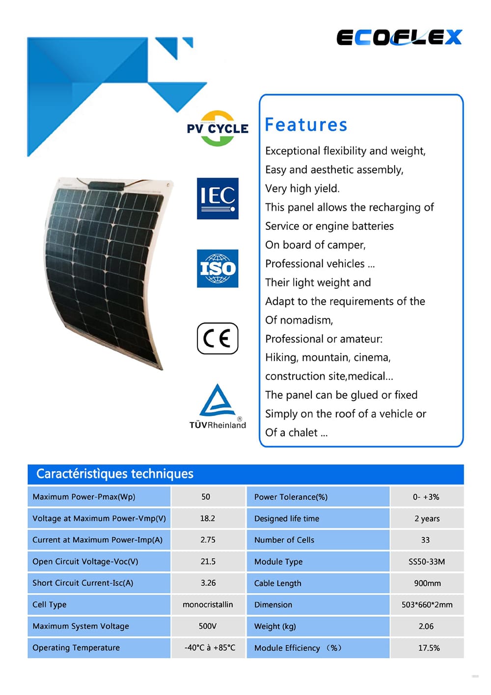 La Placa solar flexible FGM-FL 12V/50W de supermercadosolar es un panel solar de alto rendimiento, durabilidad y fiabilidad. Adecuado para cualquier instalación fotovoltaica, tanto instalaciones solares aisladas como de autoconsumo, telemetría, etc.